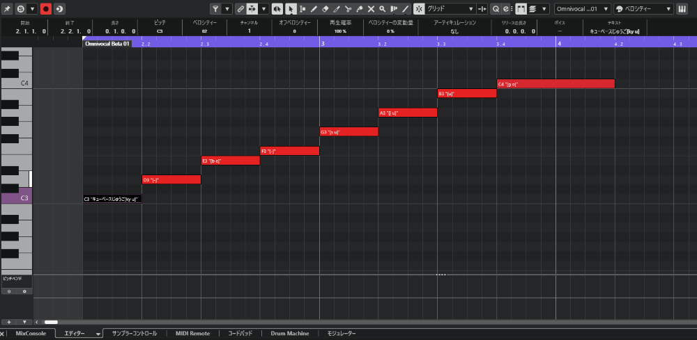 Cubaseのキーエディター内で歌詞の打ち込みが可能です。操作はとてもカンタンで、即座に歌ってくれるのでめちゃくちゃ楽しいです。