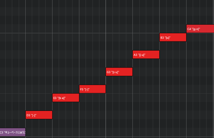 先頭のノートに打ち込んだ歌詞が確認できます。そのあとのノートのカッコ内にアルファベットでの発音が表示されるので、とても分かりやすいですね。