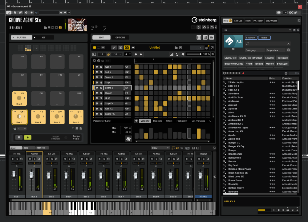 音源内部にパターンエディターを搭載したおかげで、Groove Agent SE 6でリズムトラックを完結されることができまるようになったのは非常に嬉しいですね。